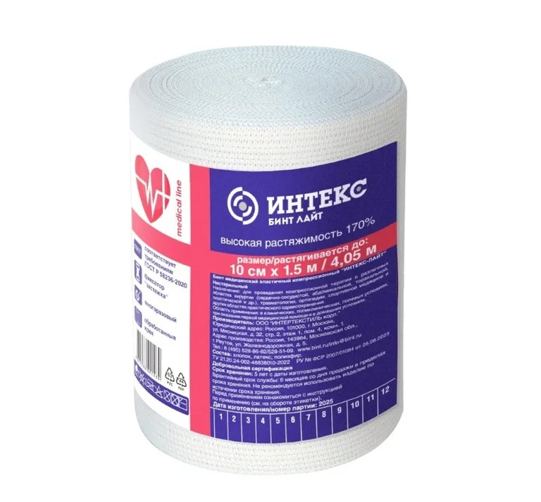 Эластичный компрессионный бинт Интекс-Лайт предназначен для наложения фиксирующих и компрессионных повязок. Используется в хирургии, травматологии, ортопедии, спортивной медицине и в домашних условиях для профилактики и лечения различных заболеваний вен и травм мягких тканей.