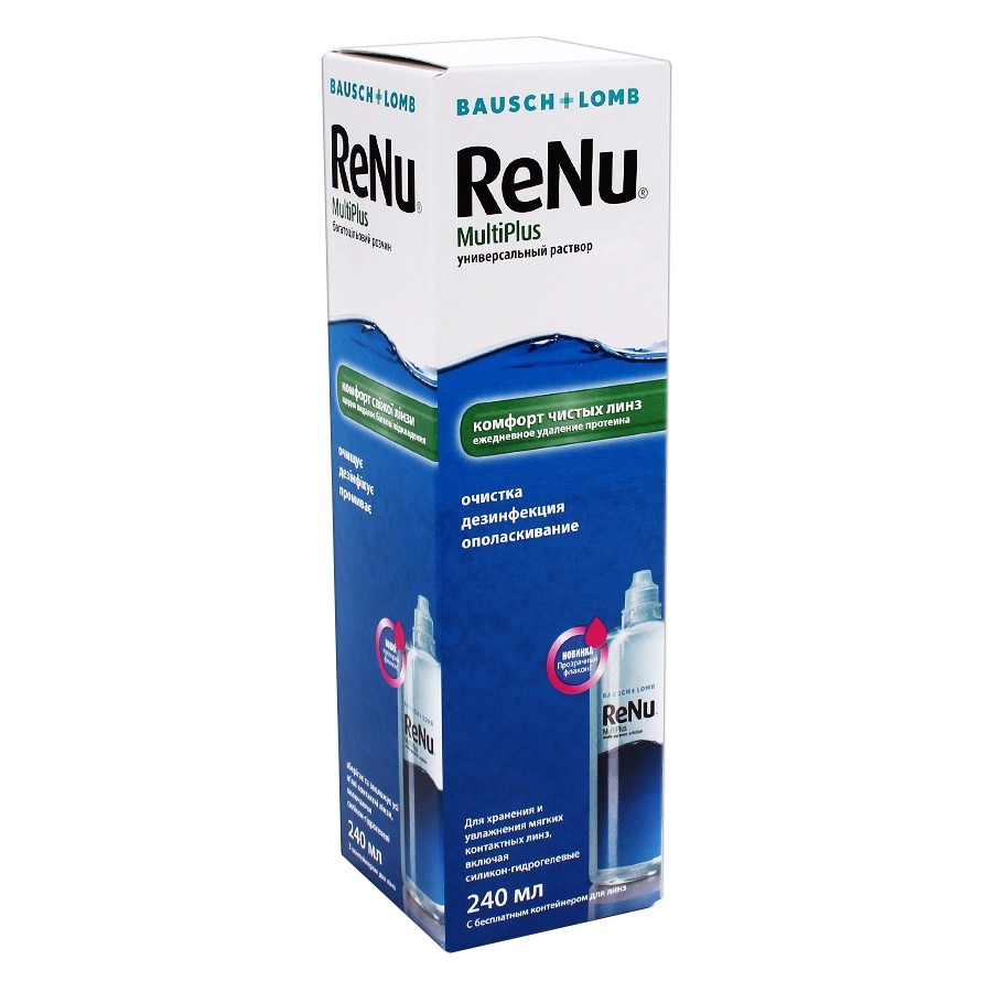 ReNu MultiPlus 240 мл — многофункциональный раствор для мягких и силикон-гидрогелевых контактных линз, обеспечивающий полное очищение, дезинфекцию, удаление белковых отложений, увлажнение и безопасное хранение. Эффективно удаляет загрязнения, жир, протеины и предотвращает размножение бактерий и грибков. Подходит даже для чувствительных глаз и длительного ношения линз.