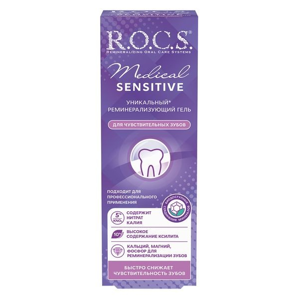 R.O.C.S. Medical Sensitive — профессиональный реминерализирующий гель для укрепления эмали и быстрого снижения чувствительности зубов. Разработан для применения в стоматологической практике и для домашнего использования строго по рекомендации врача.