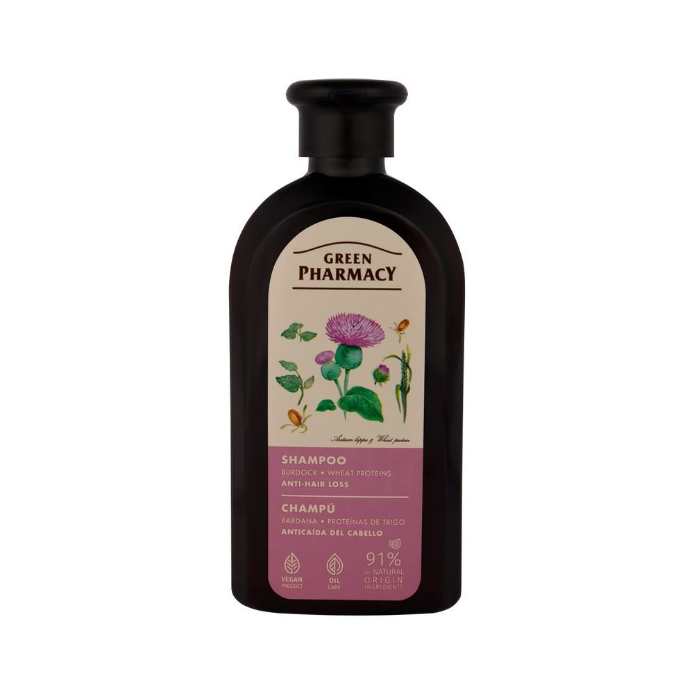 - Шампунь против выпадения волос 350мл. Репейник/Протеины пшеницы Зеленая Аптека