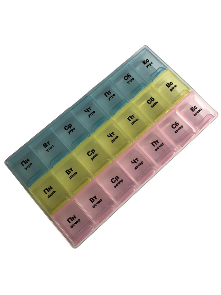 Таблетница на неделю 21 секция — удобный и вместительный органайзер для хранения лекарств, витаминов и БАДов, рассчитанный на 7 дней с учётом трёх приёмов в день — утром, днём и вечером.
