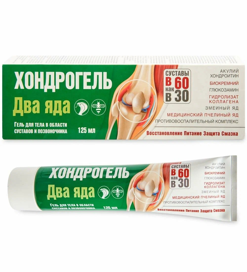 Хондрогель «Два яда» — средство для ухода за областью суставов и позвоночника. Формула сочетает пчелиный яд, полипептиды скорпиона, хондропротекторы, коллаген и биостимулирующий комплекс, что помогает поддерживать здоровье опорно-двигательного аппарата.